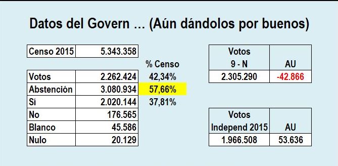 Algunos hechos, difundidos como “resultados oficiales y corroborados”, convierten el pucherazo en un esperpento: Jordi Turull, conseller de presidencia de Puigdemont, llegó a anunciar que se habían escrutado el 100,88% de los votos, y en algunos pueblos se presentan una cantidad de votos a favor de la independencia que duplican el censo real…