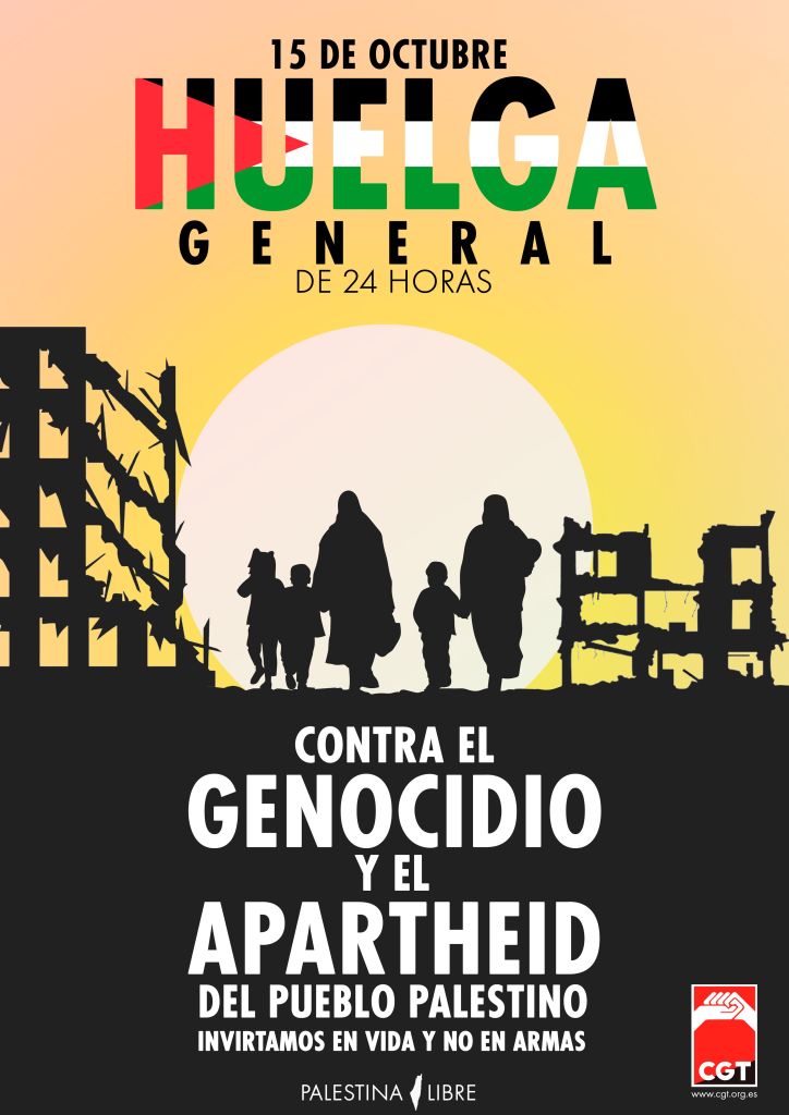 La Confederación General del Trabajo (CGT) convoca una huelga general de 24 horas en todos los centros de trabajo contra el genocidio y el apartheid de Israel, así como contra la militarización que impone la OTAN, que conlleva recortes sociales. Esta convocatoria ha sido secundada por centrales como Solidaridad Obrera, ASC (Alternativa Sindical de Clase), o la Confederación Intersindical