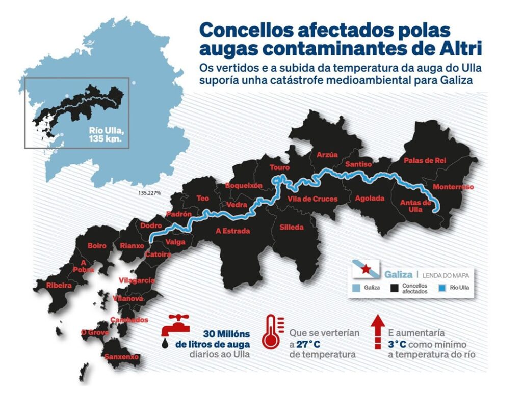 A la contaminación de la cuenca del rio Ulla y de su desembocadura en la ria de Arousa que supondría este megaproyecto se suma ahora la autorización de la Xunta para que la mina de Touro-O Pino -en la misma cuenca- reanude su actividad.