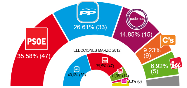 Si las generales del 2011 significaron el desplome de la pata izquierda del bipartidismo, el descalabro del PP anticipa con bastante probabilidad un desplome relativamente similar de su pata derecha. La pérdida de más de medio millón de votantes, un tercio de los votos obtenidos en 2012, se mueve en una horquilla aproximada a lo que perdió el PSOE entre las elecciones de 2008 y 2012.
