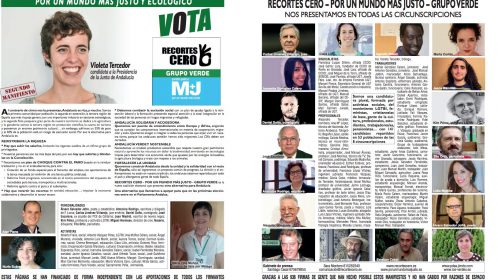 RECORTES CERO – POR UN MUNDO MÁS JUSTO – GRUPO VERDE (Recortes Cero-M+J-GV) presenta el segundo manifiesto de su programa para las elecciones andaluzas con el lema de campaña: “Redistribuir la riqueza en Andalucía, por un mundo + justo y ecológico”. A este segundo manifiesto, se incorporan firmantes y promotores como Carlos Jiménez Villarejo, juez…
