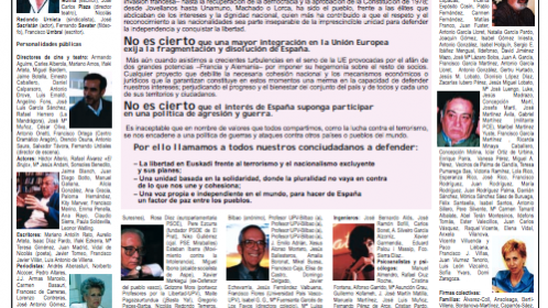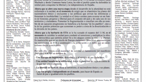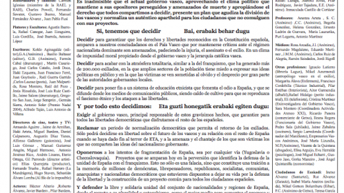 Publicado en El Correo Español del Pueblo Vasco 9-4-2005 Texto «Es inadmisible que el actual gobierno vasco, aprovechando el clima político que mantiene a sus opositores perseguidos y amenazados de muerte y apropiándose el derecho que todos compartimos a decidir, presente un plan que agudiza la división de los vascos y normaliza un auténtico apartheid…