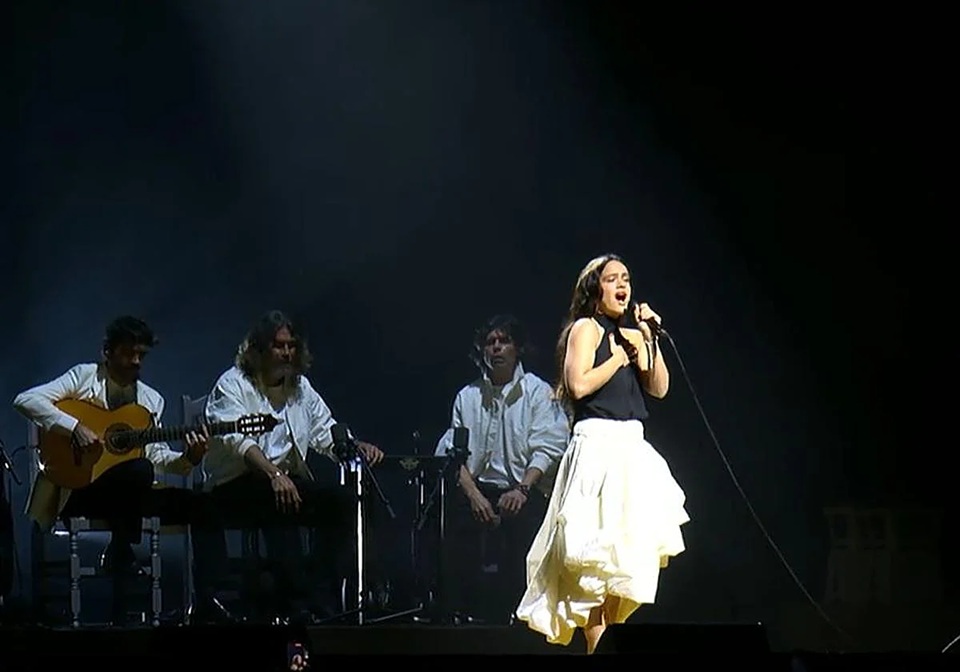 Pero los organizadores tenían un as en la manga. La sorpresa de la noche -no estaba prevista en el cartel- la dió la cantante Rosalía, que quiso ser profeta en su propia tierra en apoyo a la causa de la solidaridad por Palestina.