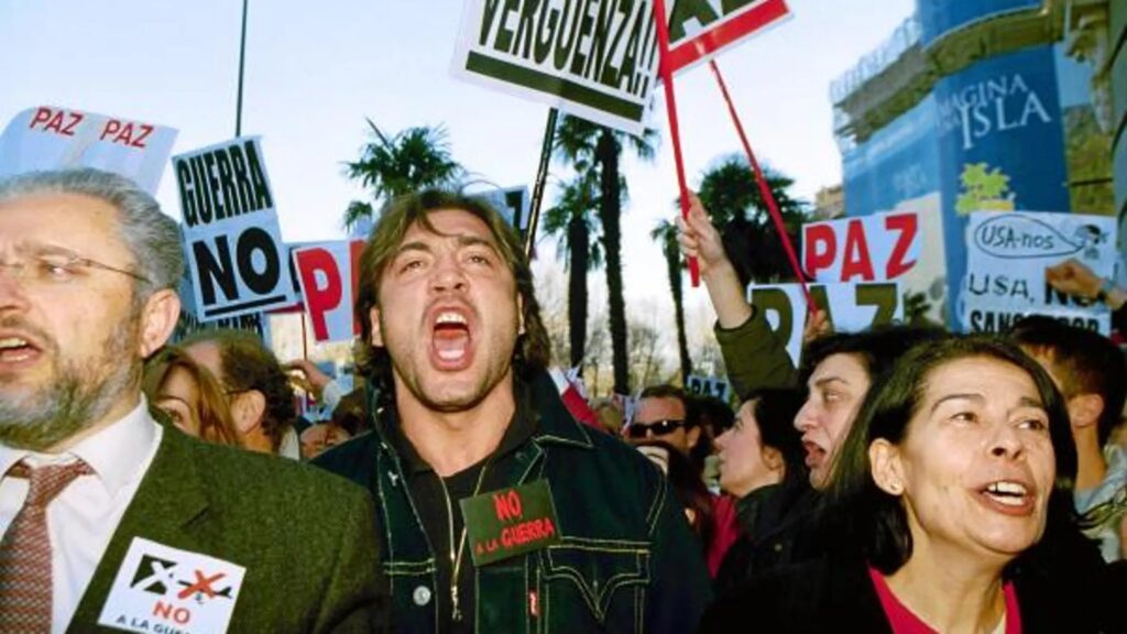 “No a la guerra y Palestina libre”, dijo contundente antes de entregar el Oscar a mejor película internacional a ‘Valor sentimental’. Lo hizo luciendo en la solapa, junto a una chapa por Palestina., una enorme cartulina donde, rojo sangre sobre negro, se podía leer en español: «NO a la GUERRA». El emblema que es historia de nuestro cine y de nuestro país, y que sacó a millones de españoles a la calle contra la guerra de Irak en 2003.