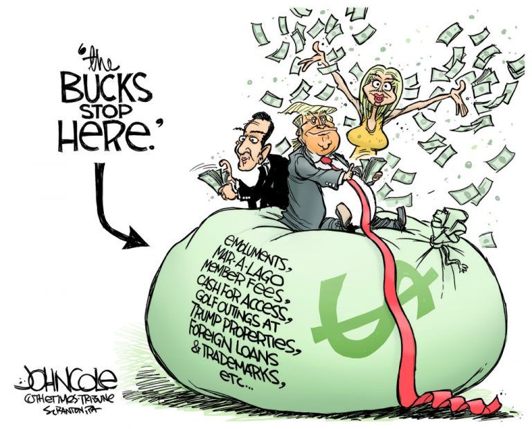 Que un presidente norteamericano se enriquezca gracias a su cargo no es ninguna novedad. Los Obama declaraban un patrimonio de 1,3 millones al llegar a la Casa Banca. Durante su presidencia se multiplicó por 35, y ahora se eleva a 70 millones. La particularidad de Trump es el volumen, miles de millones, y la desvergonzada publicidad de sus negocios.