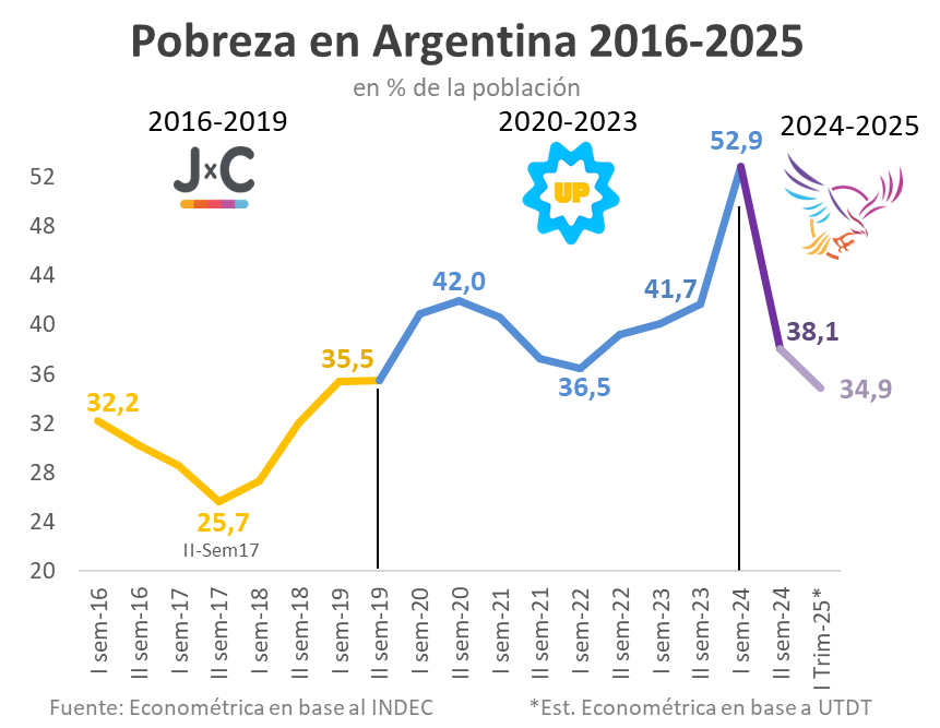 Los últimos gobiernos en que objetivamente bajaron los índices de pobreza fueron los de Néstor y Cristina Kirchner. Durante el primero, la cantidad de familias pobres disminuyó del 62 por ciento en 2003 a 37 por ciento en 2007. En el segundo mandato kirchnerista, la pobreza cayó del 37 al 28% y luego, durante el segundo mandato, volvió a subir al 30%.