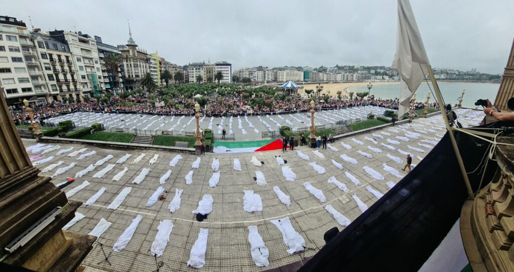 Medio millar de personas amortajadas han simulado en Donostia una morgue gazatí al aire libre. Una espectacular acción para exigir el fin inmediato del genocidio que Israel perpetra en la Franja