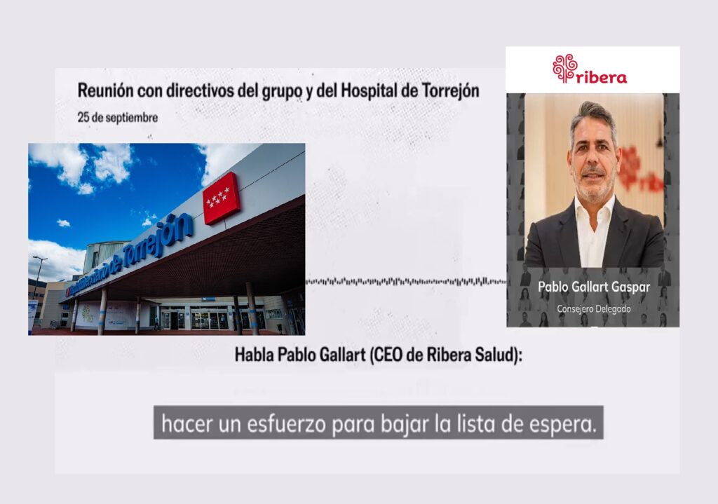 Es 25 de septiembre, y la grabación a la que ha tenido acceso El País muestra una reunión de Pablo Gallart, CEO de Ribera Salud con una veintena de mandos del Hospital de Torrejón. En ella el ejecutivo plantea claramente la ecuación: un mayor esfuerzo por mejorar la cantidad y la calidad asistencial -reduciendo las listas de espera- significa mayores costes y menores beneficios. Y por tanto, desde el punto de vista de la compañía… hay que hacer lo contrario.
