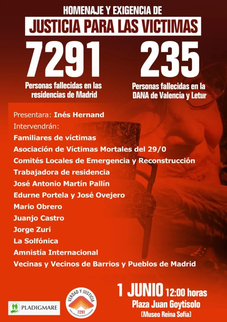 Tercero, esta lucha, así como las de las víctimas de la Dana en Valencia, anima a otras luchas populares que a su vez están interconectadas con otra indecente gestión de las crisis sanitarias que ha protagonizado el gobierno de Díaz Ayuso: el de las 7291 víctimas mortales de las residencias madrileñas durante la pandemia de Covid-19, por culpa de unos protocolos de la vergüenza emitidos por el gobierno de la Comunidad de Madrid, y que impidieron que se trasladara a los ancianos que no tenían un seguro privado a los hospitales públicos,
