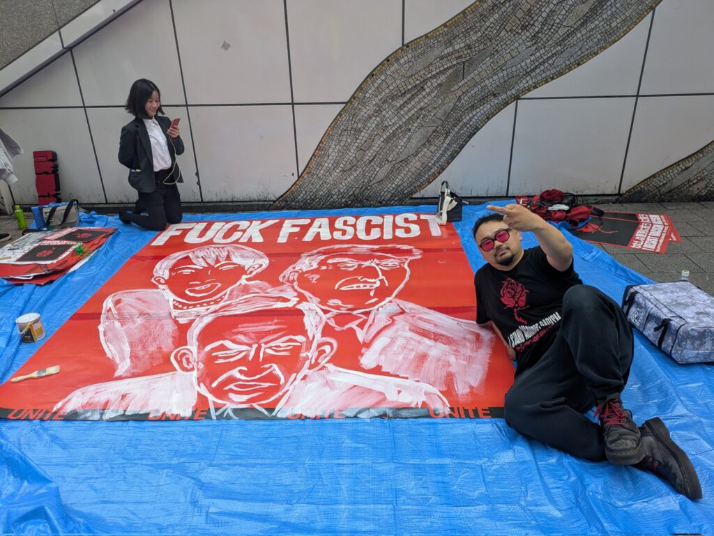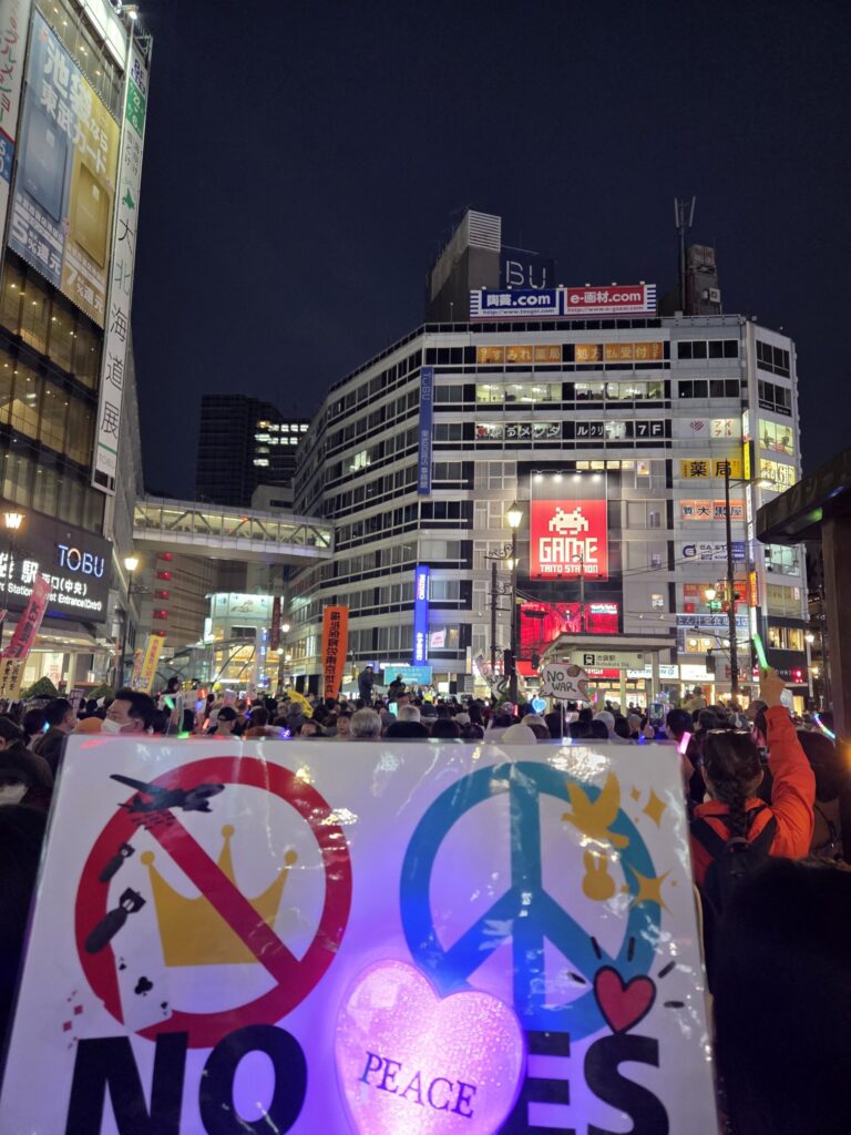 Pero a los pocos días, el doble de manifestantes se congregaron frente al Parlamento, y frente a la residencia de la primera ministra, clamando contra el ataque a Irán y a Líbano y las pretensiones de Takaichi de modificar la cláusula pacifista de la Constitución con consignas como «No a la Guerra», “Mantengamos el Artículo 9”, “No a la alianza ilimitada con Trump”, “Yankee go home”.