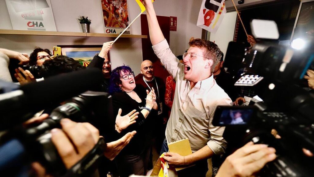 La Chunta Aragonesista y su candidato Jorge Pueyo han cosechado unos extraordinarios resultados. Con casi 64.000 votos y 6 escaños duplican los resultados de 2023, mejorando hasta los vaticinios más optimistas que cualquier encuesta les había dado. Es además el mejor resultado de CHA desde 2003.