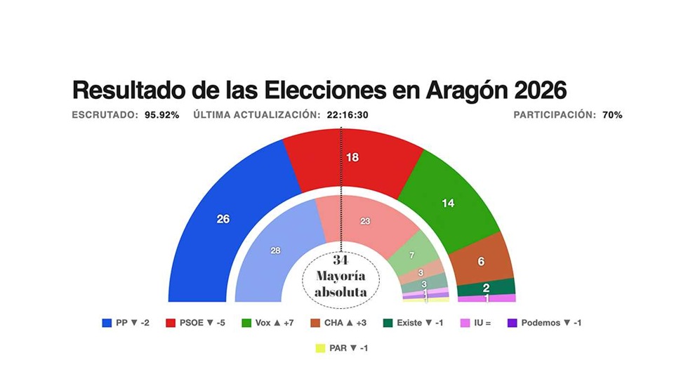 No sólo no podrá, sino que ahora -como la presidenta autonómica- se las tendrá que componer con un partido de ultraderecha que duplica sus escaños (de 7 a 14) y obtiene más de 117.000 votos. La correlación de fuerzas entre PP y Vox en Aragón ya no es de 3 a 1, sino de 2 a 1. Y eso se va a traducir en un mayor poder de los de Abascal para lanzar órdagos y chantajes, para exigir cargos y consejerías, para imponer agendas ultrareaccionarias y mayores ataques a los derechos de las mujeres, de los migrantes, de las minorías, o para impulsar recortes sociales y privatizaciones.