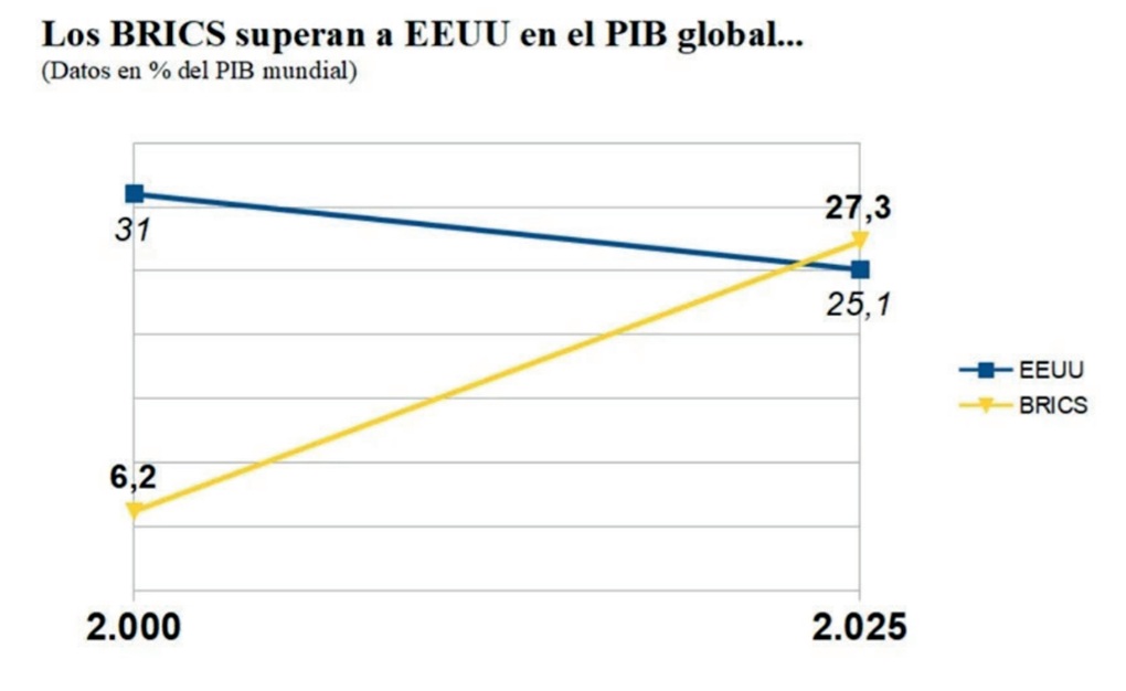 Pero no es una peculiaridad exclusiva de China. Los países que hoy forman los BRICS solo suponían el 6,2% de la riqueza mundial al comenzar el siglo XXI, y hoy suponen el 27,3%. Más que EEUU.