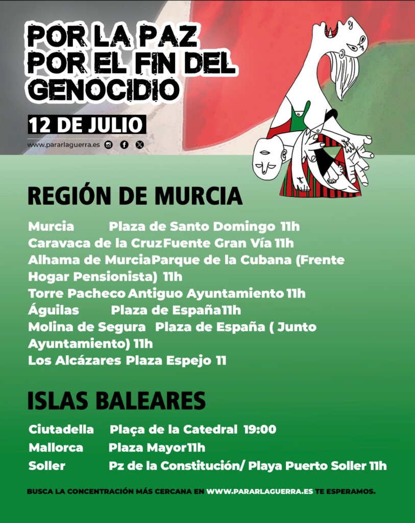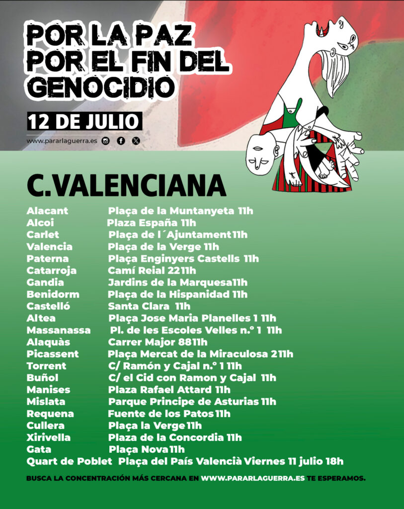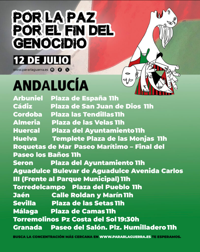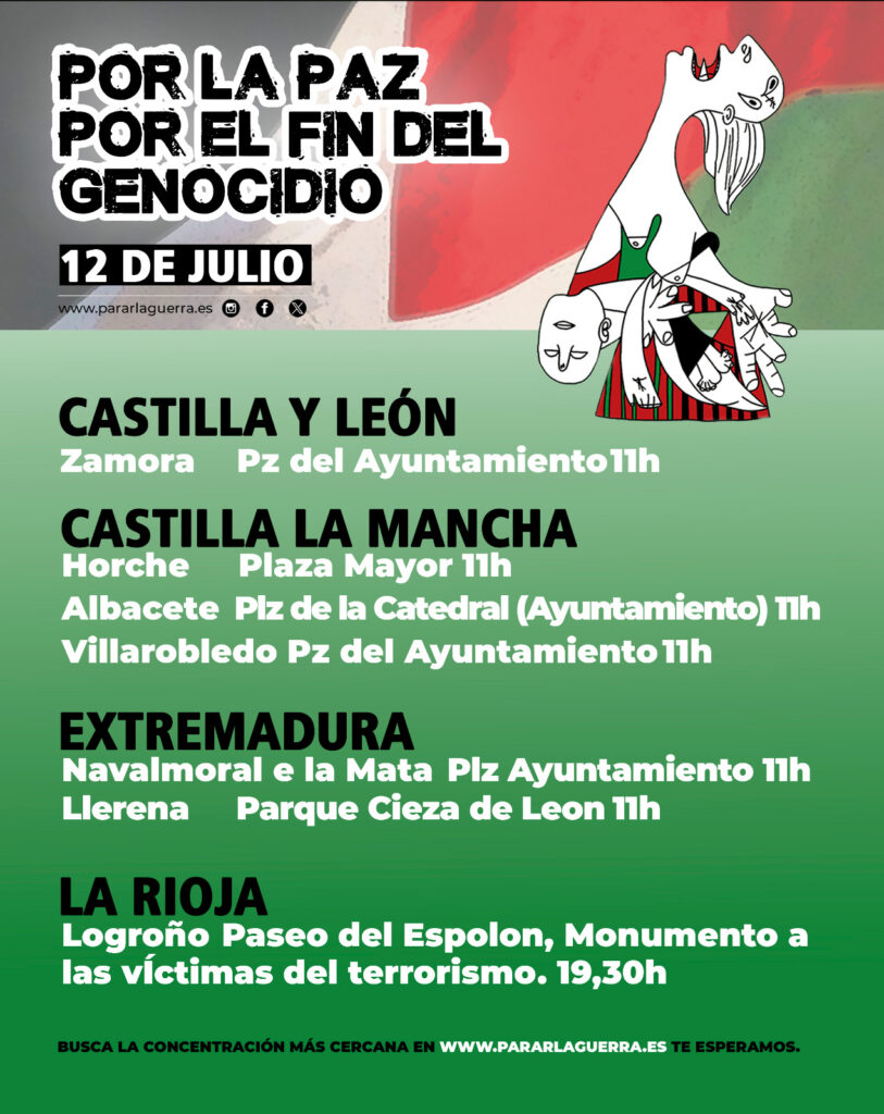 Por ello, y al igual que ya hizo el pasado 14 de junio convocando casi 140 concentraciones por todo el país, «PararLaGuerra.es llamamos a toda la ciudadanía, sin distinción de ideologías o credos, sin importar la región o el país en el que se viva, a apoyar la movilización y a acudir a las concentraciones por la Paz y por el Fin del Genocidio del próximo 12 de julio».