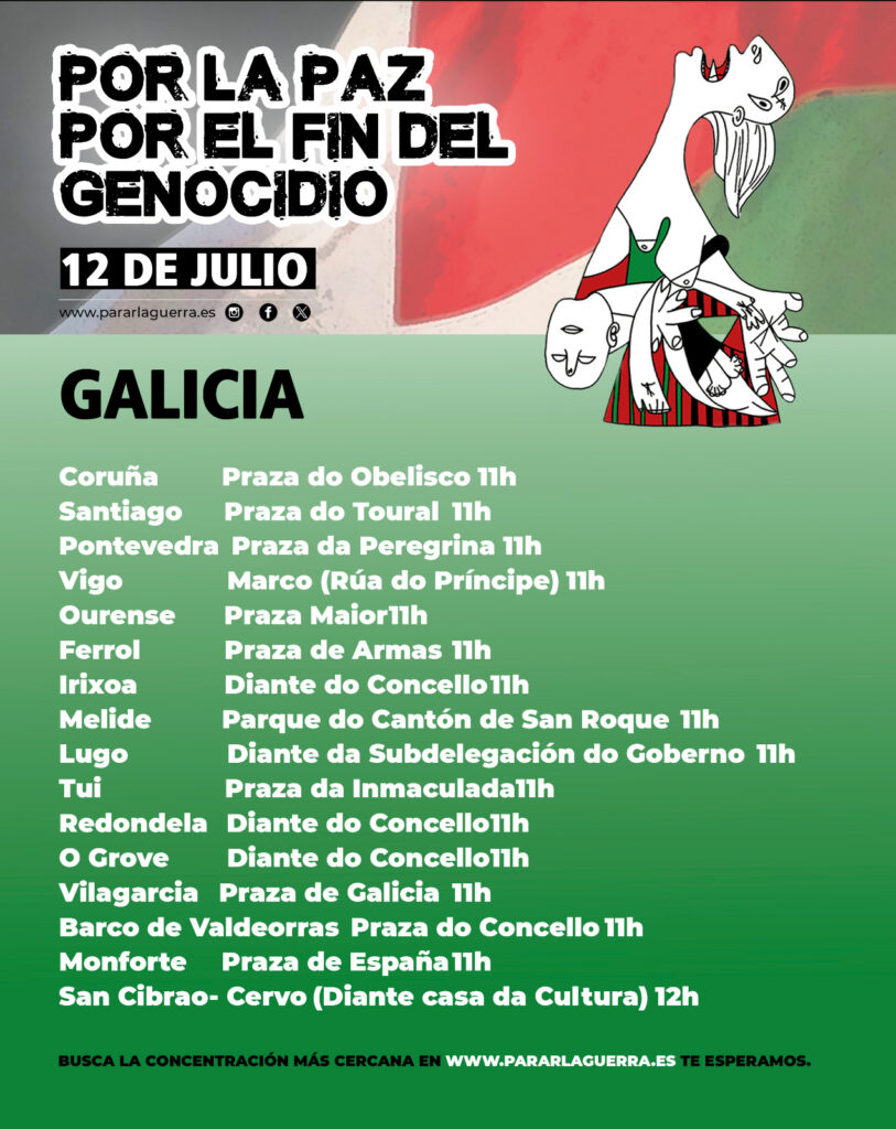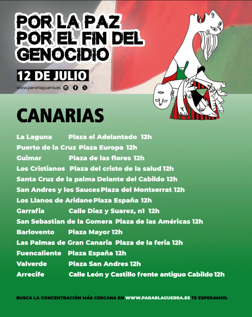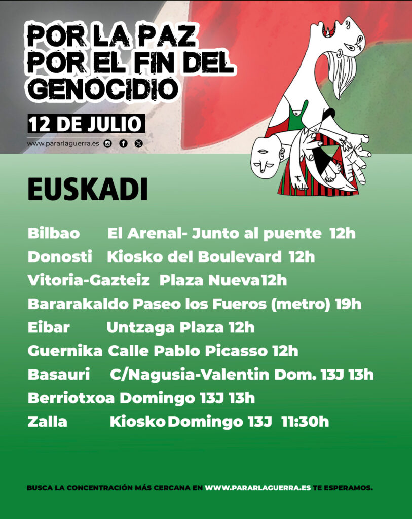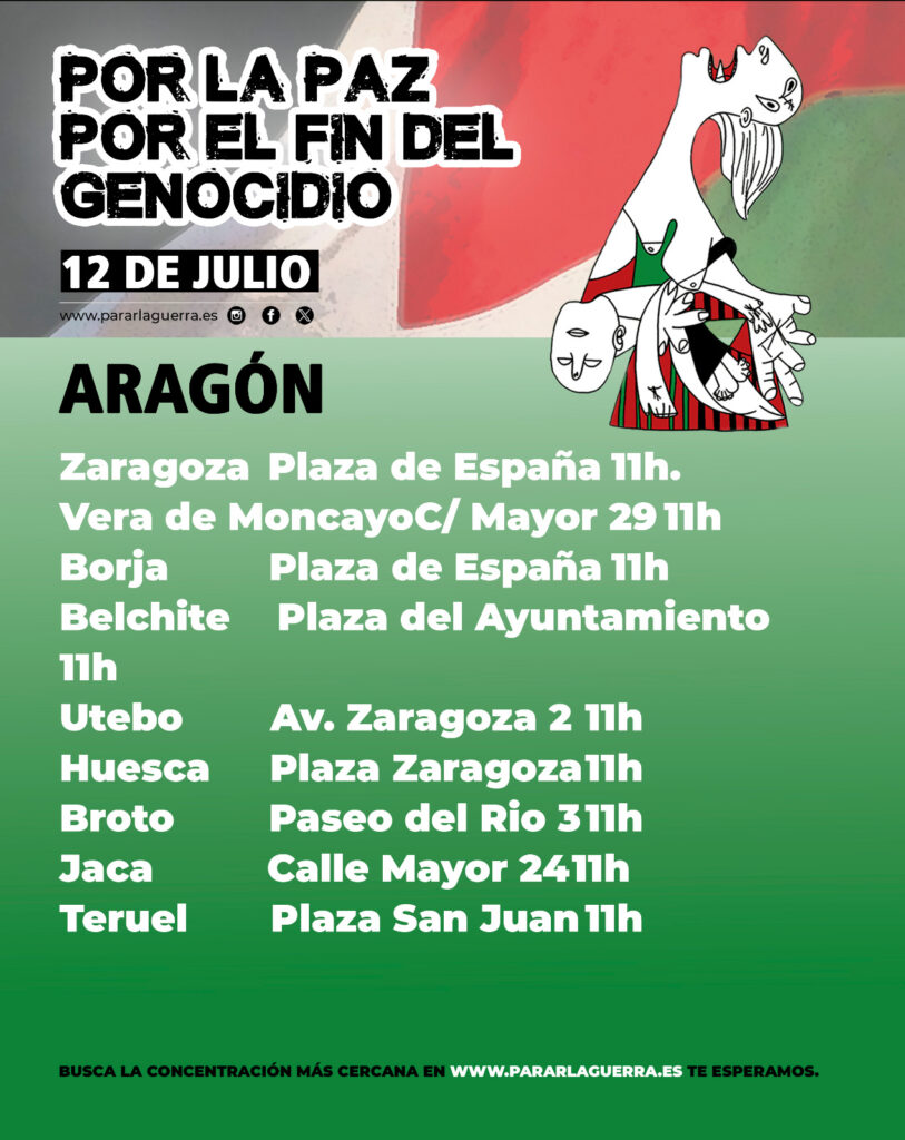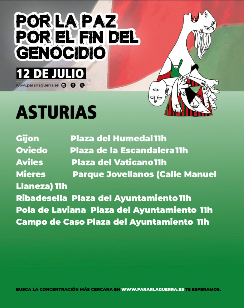 Por ello, y al igual que ya hizo el pasado 14 de junio convocando casi 140 concentraciones por todo el país, «PararLaGuerra.es llamamos a toda la ciudadanía, sin distinción de ideologías o credos, sin importar la región o el país en el que se viva, a apoyar la movilización y a acudir a las concentraciones por la Paz y por el Fin del Genocidio del próximo 12 de julio».