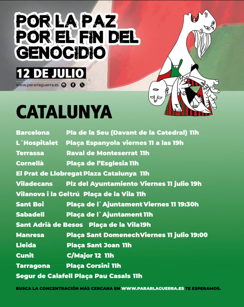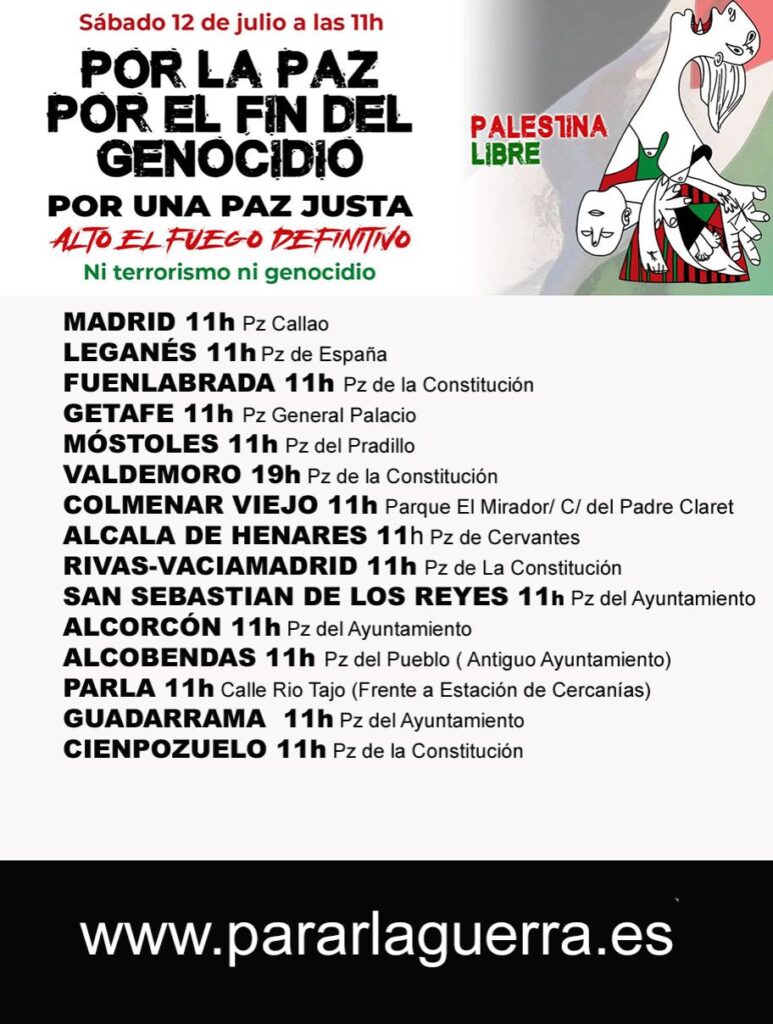 Este sábado 12 de julio, a las 11 de la mañana, PararLaGuerra.es convoca cientos de concentraciones unitarias contra el Genocidio en Gaza y contra la escalada de guerra en Oriente Medio perpetrada por Trump y Netanyahu.