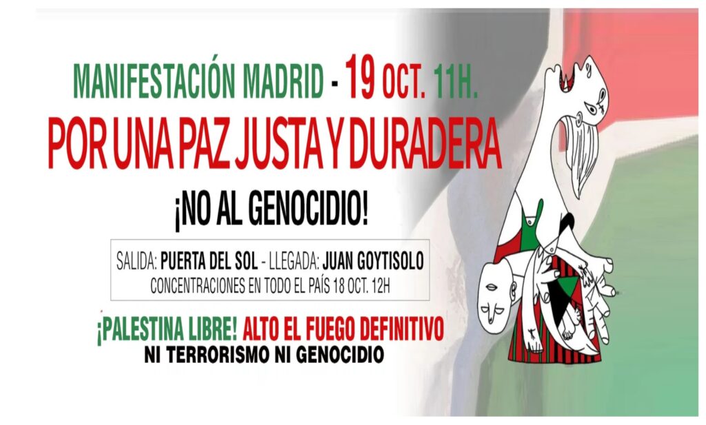 La plataforma PararLaGuerra convoca este sábado 18 de octubre concentraciones en hasta 250 ciudades y poblaciones de todo el país con el lema «Por una Paz Justa y Duradera. No al Genocidio. Palestina Libre. Alto el fuego definitivo. Ni terrorismo, ni genocidio».