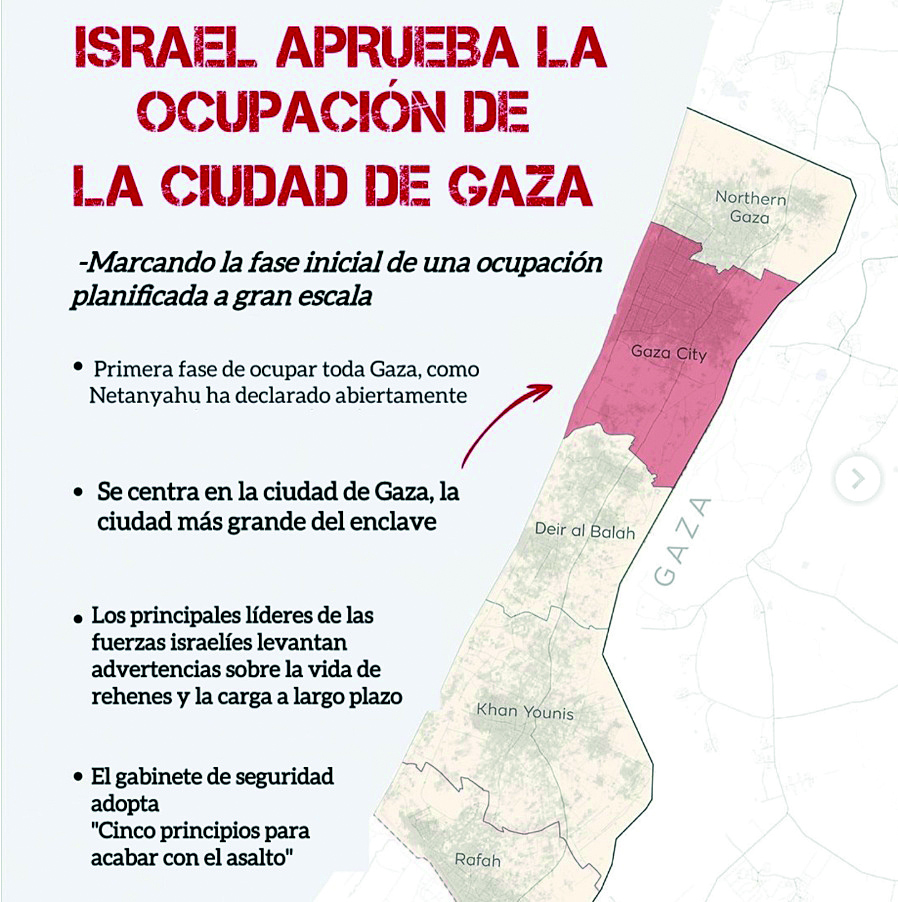 Desoyendo la creciente presión dentro y fuera de Israel, ignorando el acuerdo de paz que -de la mano de Qatar o Egipto- ofrece Hamás, el ultrasionista gobierno de Netanyahu, siempre con el total respaldo de la administración Trump, se prepara para tomar por la fuerza la ciudad de Gaza, en cuyas ruinas se calcula que malviven un millón de palestinos.