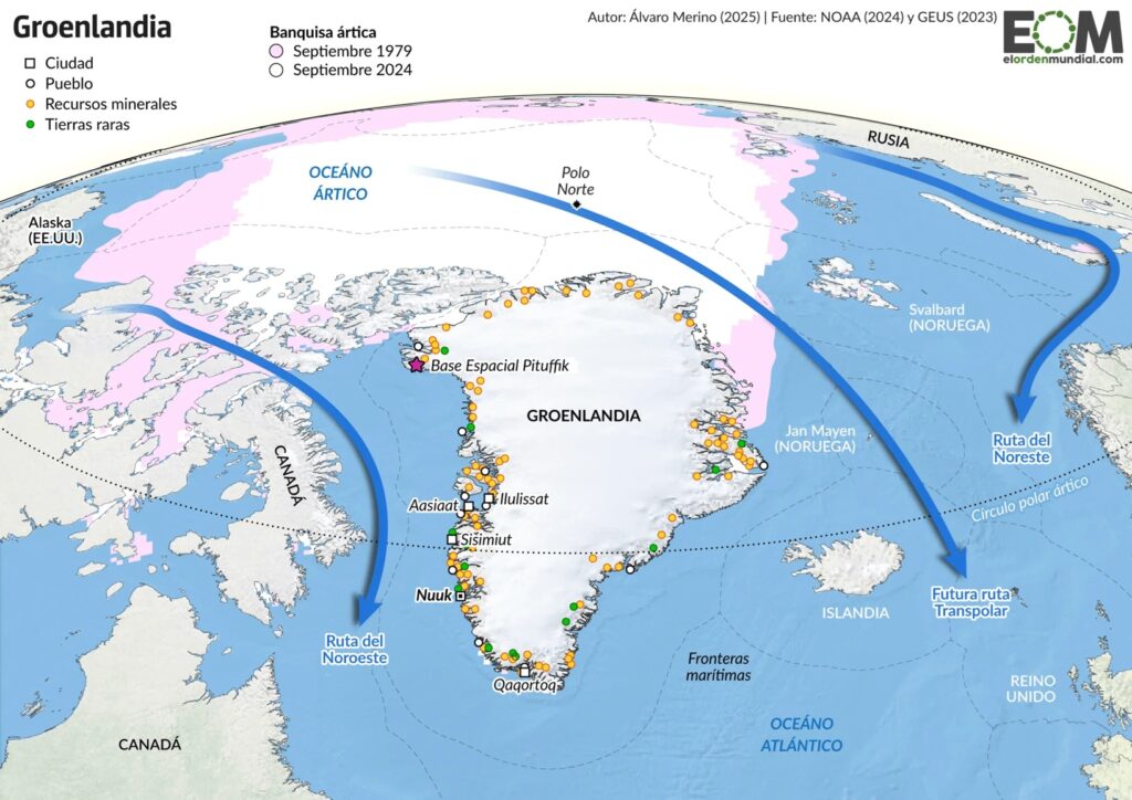 Si hace algunas décadas alguien hubiera preguntado por los “puntos calientes” del planeta, los enclaves o regiones que son decisivos desde el punto de vista geopolítico, seguramente todo el mundo habría mencionado a Oriente Medio, la península de Corea o el Mar de China… pero nadie hubiera pensado en los hielos del Círculo Polar Ártico, o en la gélida isla de Groenlandia.