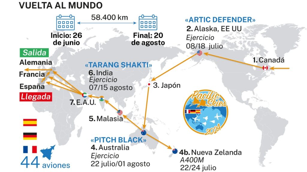 Este no es el primer despliegue de las Fuerzas Armadas españolas en el Indo-Pacífico. El año pasado, cuatro aviones de combate Eurofighter y dos aviones de transporte A400M, con un destacamento de 200 militares, pasaron por India, Japón o Australia dentro del ejercicio Pacific Skies. Desde Alaska hasta Australia, con la India como destino final, junto con aeronaves de Francia y Alemania en un despliegue inédito en el que los aviones recorrieron 58.000 kilómetros en un total de 56 días, con 43 jornadas de ejercicios y 13 de proyección.
