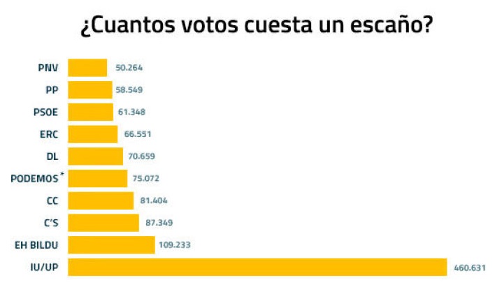 Mientras al PNV solo le cuesta poco más de 50.000 votos conseguir un diputado, o al PP algo más de 58.000… IU necesita más de 450.000 votos para alcanzar un escaño.
