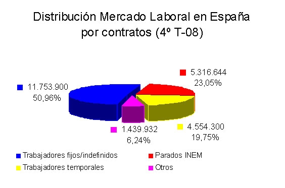Esto significa que, actualmente, en Esaña hay cerca de cuatro millones y medio de trabajadores con un alto porcentaje de riesgo de quedarse en el paro.Este informe se ha publicado la misma semana que otro de USO que sitúa un desfase entre la tasa de paro de la Encuesta de Población Activa (EPA) y los registros que reflejan las oficinas del INEM.El informe de FEDEA refleja que no todos los sectores tienen los mismos porcentajes de riesgo según el tipo de contratación laboral. Según los datos oficiales, actualmente en España hay 4.554.300 trabajadores con contratos temporales frente a los 11.753.900 indefinidos. En sectores como la industria y los servicios, los trabajadores temporales pueden llegar a tener hasta doce veces mas posibilidades de ser despedidos que los indefinidos.En el mercado español hay actualmente, tres grandes modelos de contratación. Los fijos, los indefinidos y los temporales. Los primeros tienen una indemnización por despido de 45 días y suelen ser aquellos que afectan a trabajadores de mayor edad, con carreras laborales mas largas y los mas costosos de despedir. La política de prejubilaciones está reduciendo este sector de asalariados.En segundo lugar se encuentran los indefinidos. Una modalidad que se creó con la reforma laboral de 1997 como un incentivo para contratar a trabajadores de forma mas estable y que cuenta con una indemnización entre 33 y 22 días por año trabajado.Los temporales, que representan casi un tercio del mercado laboral en España. La media actual de contratos temporales es de tres a seis meses y esta modalidad cuenta con un sin fin de modalidades que abarcan contratos de una hora, en los que no se da de alta al trabajador pero lo elimina de las listas del paro durante un trimestre, hasta seis meses. Las formulas mas empleadas son el contrato eventual a tiempo parcial, por obra o servicio o de interinidad. En 2008 se firmaron 7,6 millones de contratos eventuales, 6,8 por obra y servicio y 1,5 por interinidad.El hecho de que el debate sobre la reforma laboral se esté centrando en los costes de los despidos, tal y como han apuntado últimamente el Presidente del Bando de España o la Patronal CEOE hace pensar que la tasa del 28% de trabajadores temporales va a aumentar durante el próximo periodo. Lo que indica cual es la orientación de las recetas que tiene preparadas el gobierno como alternativa a la crisis.