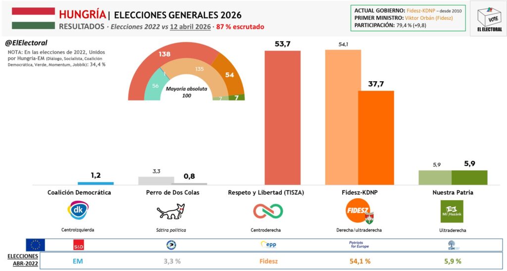 El candidato del partido opositor Tisza, Péter Magyar -también conservador, pero de perfil más moderado y europeísta- ha logrado una contundente y aplastante victoria, haciéndose con una mayoría parlamentaria de dos tercios, lo que le permitirá deshacer el sistema iliberal y antidemocrático que durante más de una década ha ido tejiendo Orbán, estableciendo un régimen clientelar con gran parte de los medios de comunicación o imponiendo su dominio sobre el poder judicial.