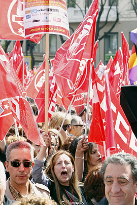 La convocatoria oficial no odía ser más vergonzante. Con un lema (“¡Que no se aprovechen de la crisis!”) ridículamente a la defensa. Y con la obsesión por esconder a los auténticos responsables de la crisis -la gran banca y el gobierno-.Méndez y Totxo se vieron obligados por la presión de las bases a convocar la manifestación, pero intentaron “echar el freno” a la movilización. Con una convocatoria reducida, e incluso preparando un recorrido estrambóticamente corto que convirtió la manifestación en una concentración.Pero la aparición de las bases de los sindicatos, formada en su inmensa mayoría por luchadores obreros, hizo que la manifestación se convirtiera en un éxito.Todos los asistentes exigían llevar la movilización hasta el final, y respaldaban las consignas contra la banca y el gobierno de Zapatero difundidas por el bloque de nuestro partido.El sábado asistimos a una demostración de la energía de lucha encerrada en la clase obrera. ¿Pero quién lo va a gestionar? ¿Totxo y Méndez, cuyo papel es ser “cortafuegos” de la movilización obrera, para que ésta no cuestione los intereses vitales del gran capital financiero? ¿Los líderes de unos sindicatos mayoritarios que se disponen a firmar una reforma laboral que va a ser una nueva agresión a los trabajadores? Es hora de darle la vuelta a la línea dominante impuesta por las cúpulas sindicales. Es el momento de organizar, en el seno de los sindicatos, toda la energía y capacidad de lucha presente en la manifestación.En las bases de los sindicatos son aplastantemente mayoritarias las posiciones de un sindicalismo de clase, unitario y combativo. La irrupción de la clase obrera, con la movilización en Madrid, crea condiciones para empezar a crear otra correlación de fuerzas en el seno del movimiento obrero.Impulsando en el seno de los sindicatos una línea revolucionaria, que permita desplegar las enormes energías de la clase obrera contra nuestros auténticos enemigos, ese gran capital financiero tan mágnánimamente tratado por el gobierno de Zapatero.Esta batalla en el seno del movimiento obrero es decisiva para que podamos imponer una salida a la crisis favorable a los intereses del conjunto del pueblo trabajador.