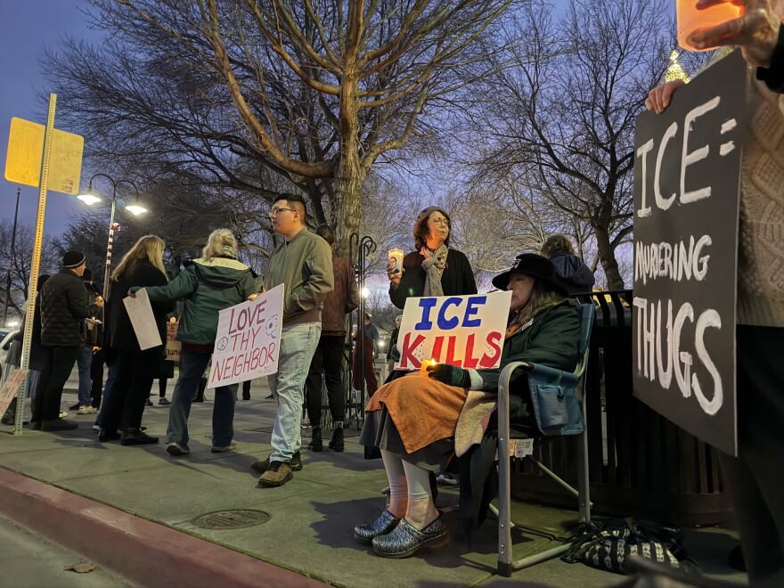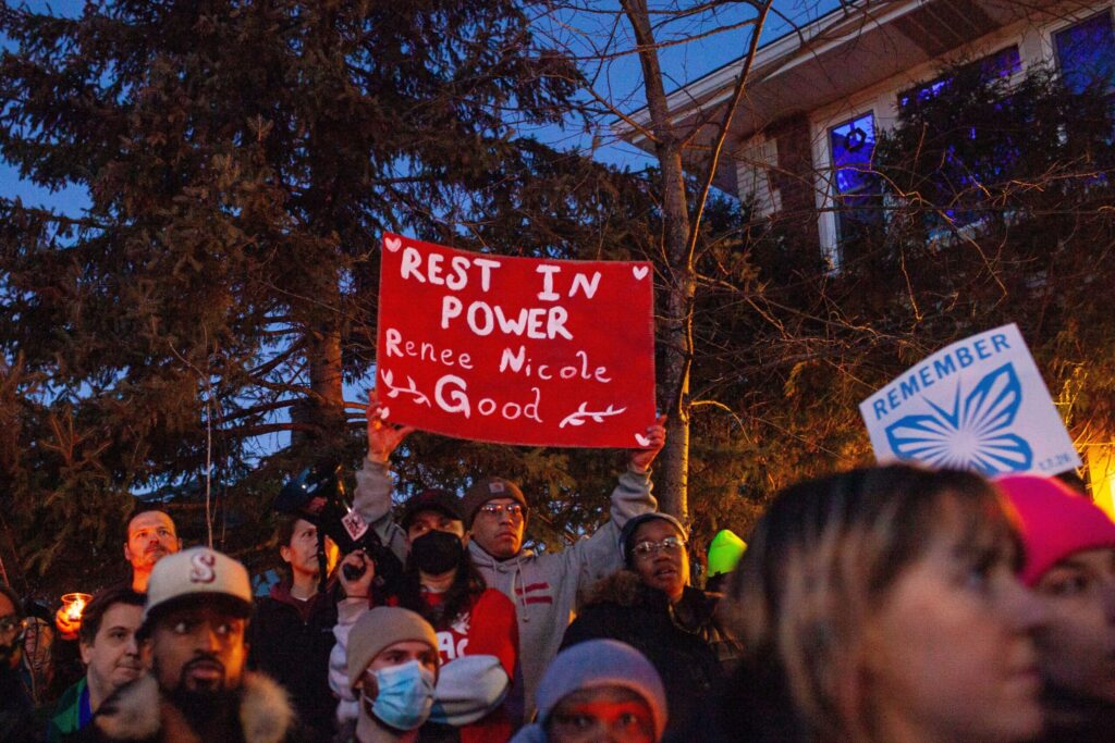 Por la noche, la concentración se transformó en una vigilia masiva con varios miles de personas y la presencia de numerosos medios de comunicación, donde se colocaron velas, flores y rosas blancas en un memorial improvisado. Los manifestantes cantaron «Say her name: Renee Good», corearon consignas como «ICE out now» («ICE fuera ahora»), «No Trump, no troops» y exigieron justicia y la expulsión inmediata de ICE de la ciudad. La vigilia continuó hasta altas horas de la madrugada del 8 de enero, con fogatas para combatir el frío y llamamientos a la acción contra las redadas migratorias.