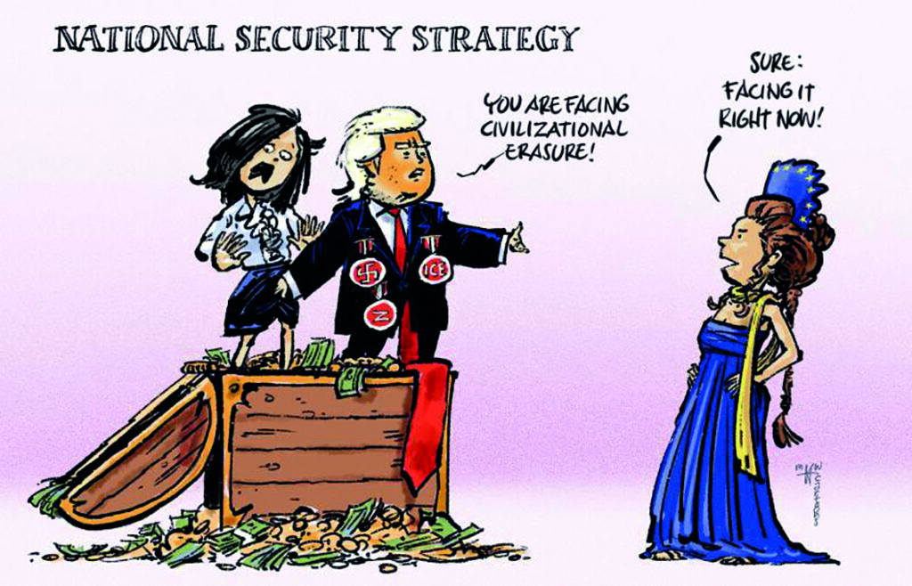 Como dice Enric Juliana en La Vanguardia: La Estrategia de Seguridad Nacional de la segunda Administración Trump es manifiestamente hostil a la Unión Europea. El documento vaticina una hecatombe civilizatoria en Europa como consecuencia de la inmigración masiva, las bajas tasas de natalidad y la “pérdida de identidad nacional”. El documento estratégico sostiene que EEUU deberá apoyar a los “partidos patrióticos” que han surgido en casi todos los países europeos [es decir, los miembros de la «internacional de la extrema derecha, con Meloni en Italia, Orbán en Hungría, Le Pen en Francia, Afd en Alemania, Vox y Chega en España y Portugal… ] en busca de una corrección de rumbo»