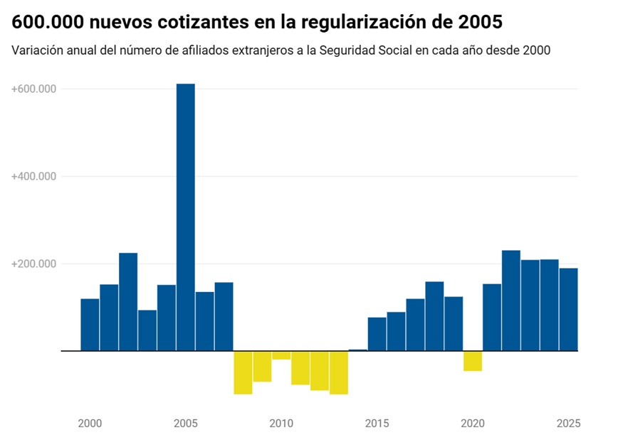 La última, la de 2005 -con el gobierno de Zapatero- fue de largo la más amplia, concediendo la residencia legal a 576.506 personas. Entonces, suma de las aportaciones de los migrantes regularizados contribuyó a un aumento de la afiliaciones a la Seguridad Social y engrosó las arcas públicas con sus correspondientes cotizaciones. Un estudio publicado en 2021 por un grupo de investigadores de la Universidad Pompeu Fabra (UPF) concluyó que cada inmigrante regularizado contribuyó entonces con una aportación de entre 4.000 y 5.000 euros al año solo con los impuestos sobre el salario.