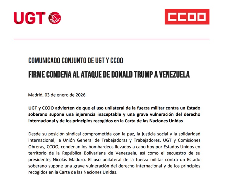 «Las dificultades económicas, sociales y laborales que atraviesa Venezuela deben ser abordadas mediante soluciones políticas, diálogo social y procesos soberanos, sin presiones externas ni intervenciones armadas. La defensa de los derechos humanos, del trabajo decente y de la democracia no puede hacerse desde la guerra ni desde la imposición», concluyen CCOO y UGT.