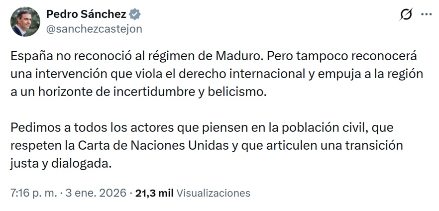 «España no reconoció al régimen de Maduro. Pero tampoco reconocerá una intervención que viola el derecho internacional y empuja a la región a un horizonte de incertidumbre y belicismo. Pedimos a todos los actores que piensen en la población civil, que respeten la Carta de Naciones Unidas y que articulen una transición justa y dialogada.», ha dicho luego Sánchez en un segundo tuit.