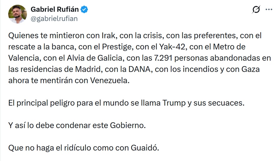 En la misma línea se ha pronunciado Enrique Santiago, diputado de IU y secretario general del Partido Comunista de España (PCE): “Trump ataca a un país hermano, ignorando la ley internacional. Toda nuestra solidaridad con la República Bolivariana de Venezuela. La comunidad internacional debe exigir de inmediato el fin de la agresión”.
