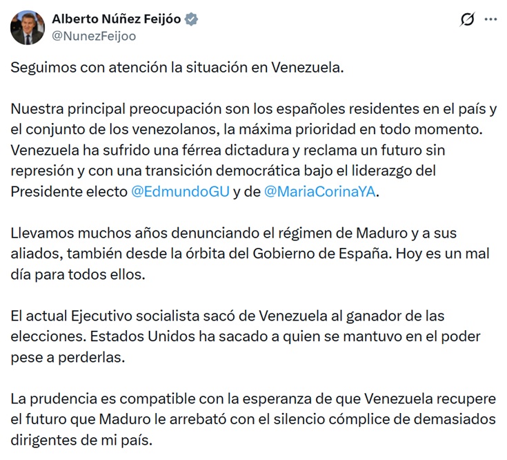 En su cuenta de X, ha evitado referirse directamente al ataque a Venezuela de Estados Unidos (quien calla otorga). “Venezuela ha sufrido una férrea dictadura y reclama un futuro sin represión y con una transición democrática bajo el liderazgo del presidente electo Edmundo González y María Corina Machado”.