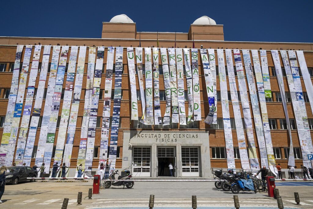 La Universidad Complutense de Madrid, la mayor del país (61.000 estudiantes), atraviesa una situación límite: sin un crédito urgente de 34 millones de euros, podría no pagar las nóminas de diciembre para sus 8.700 empleados (docentes y personal administrativo). Una situación derivada de muchos años de deliberada infrafinanciación que afecta también al resto de universidades públicas madrileñas (Autónoma, Politécnica, Alcalá, Carlos III, Rey Juan Carlos) y que ha hecho que la coordinadora de las plataformas de las universidades públicas, que integran trabajadores y estudiantes, convoque varias jornadas de huelga para noviembre.