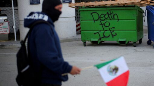 Foto 1: Un manifestante con una bandera mexicana pasa al lado de un contenedor de basura con una pintada que reza: “Muerte a ICE” (la policia migratoria de EEUU