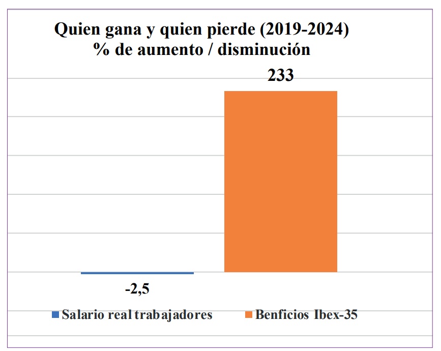 La economía española crece, pero no de la misma manera para todos. Mientras el salario real de los trabajadores es hoy menor que en 2019, los beneficios de bancos, monopolios y capital extranjero se han más que duplicado.