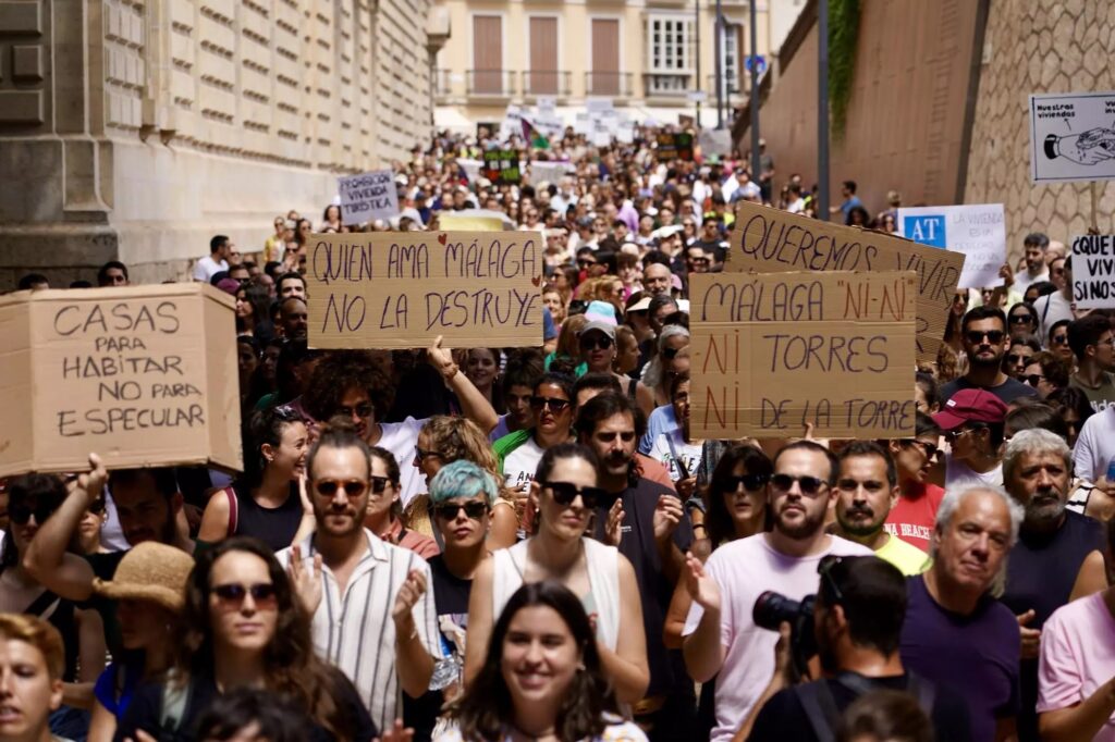 Masiva y sin incidencias, así fue la marcha de 30.000 personas por las calles de Málaga. Con infinidad de jóvenes y junto a decenas de colectivos, la manifestación liderada por el lema “Con este alquiler, no tenemos para comer” y firmada por Málaga para Vivir fue recogiendo muestras de apoyo a su paso. Un recorrido con caceroladas desde los balcones y el reconocimiento de los propios turistas que visitaban el centro de la ciudad. Una suma de voces que coincide: “la gente no puede acceder a una casa”.