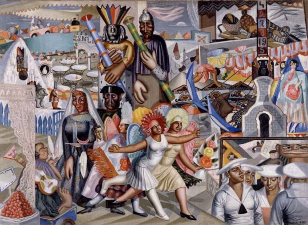 Aparecen esos dos ámbitos territoriales, España y América, con esas culturas que han definido paulatinamente también al mundo hispano. Y a la vez aparece ese disfrute de la vida por parte de las mujeres y de los hombres. Y lo mismo aparece en unos ensayos paralelos en los que aparecen escaparates de la Gran Vía de Madrid, con mucha acuarela, con neones y esos edificios muy altos, esos maniquíes, un vaso de vermouth, una copa de cava, como ese otro mundo del Rastro que también aparece. Es decir, la modernidad y el Rastro, lo que Ramón Gómez de la Serna está definiendo en sus escritos.
