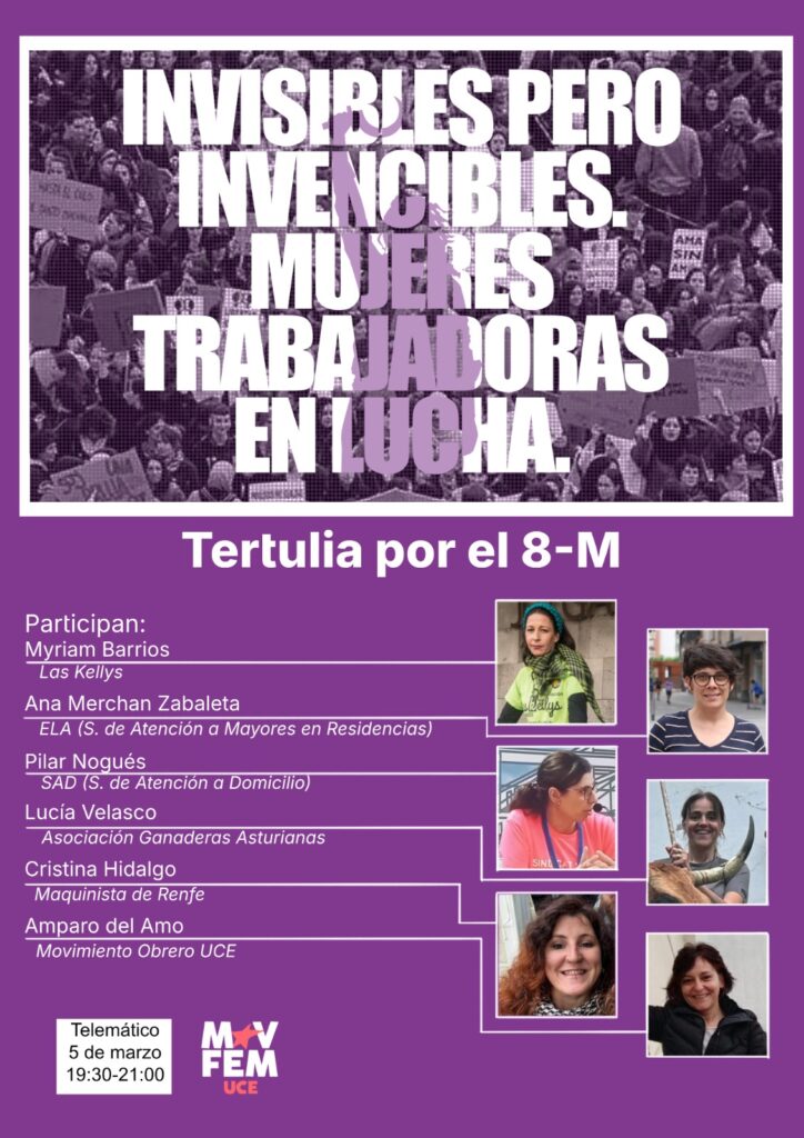 Con motivo del 8M, día internacional de la mujer trabajadora, desde UCE vamos a celebrar el próximo 5 de marzo, un encuentro telemático con diferentes colectivos de mujeres trabajadoras. Colectivos dirigidos por valientes mujeres que han decidido dar un paso adelante en la defensa propia de sus condiciones laborales.