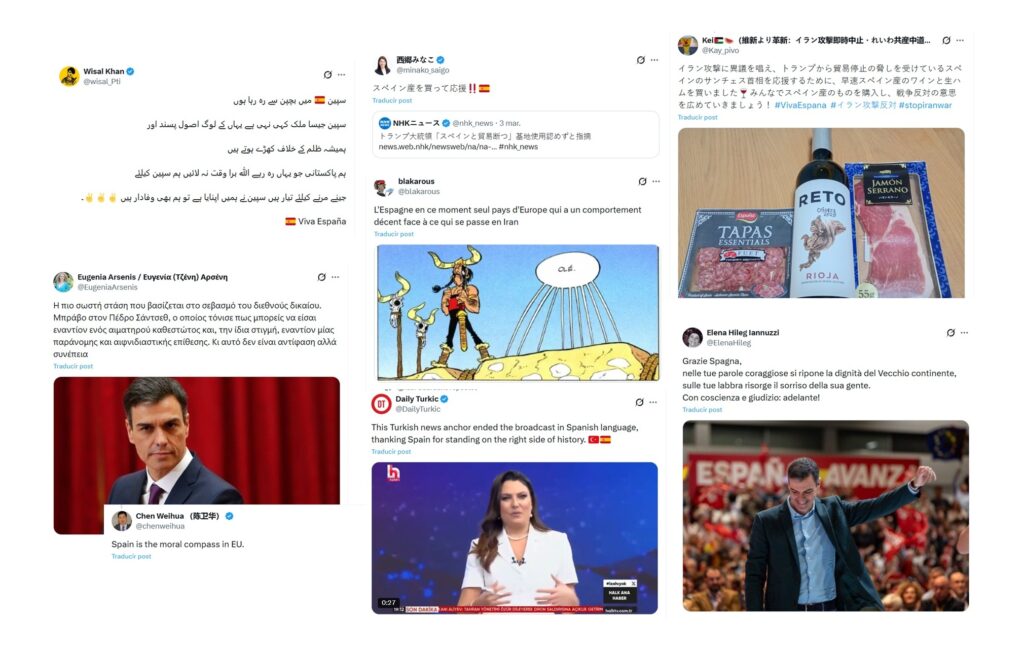 Los usuarios españoles de redes sociales se han sentido estos días entre atónitos y abrumados al descubrir miles y miles de comentarios positivos y elogiosos hacia nuestro país, hacia nuestro gobierno y hacia la posición de España ante la agresión a Irán, y la escalada en Oriente Medio. Mensajes de solidaridad y apoyo hacia España -llegados de todo el mundo- frente al señalamiento de Trump por no permitir el uso de Rota y Morón, recordando también la posición de nuestro país contra el genocidio en Gaza.