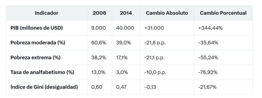 Los logros económicos y sociales de la primera década de gobiernos del MAS (2006 a 2014) son simplemente incontestables. El PIB pasó de 9.000 millones de dólares a 40.000 millones (344%), creciendo casi un 5% anual, mediante una nacionalización de los recursos naturales (primero los hidrocarburos, luego el litio) que impulsó un vigoroso proceso de redistribución de la riqueza en favor de las clases populares históricamente más relegadas y empobrecidas. En su primera década, el MAS redujo la pobreza en un 35% y la miseria extrema en un 55% gracias a sus ambiciosos programas sociales.