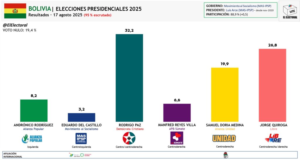 Por primera vez desde 2005, Movimiento al Socialismo–Instrumento Político por la Soberanía de los Pueblos (MAS-IPSP) no sólo no ha ganado con contundencia las elecciones en la primera vuelta, sino que ha quedado descabalgado. El desempate se librará entre dos candidatos de la derecha, representantes directos de la oligarquía boliviana y de los intereses hegemonistas: el neoliberal Rodrigo Paz, que quedó primero con el 32% de los votos; y el aún más reaccionario ex-presidente Jorqe ‘Tuto’ Quiroga, con un 26,7%. La izquierda apenas sumó el 11% de los votos válidos, quedando fuera del Senado y con un sólo escaño en la Cámara de Diputados.