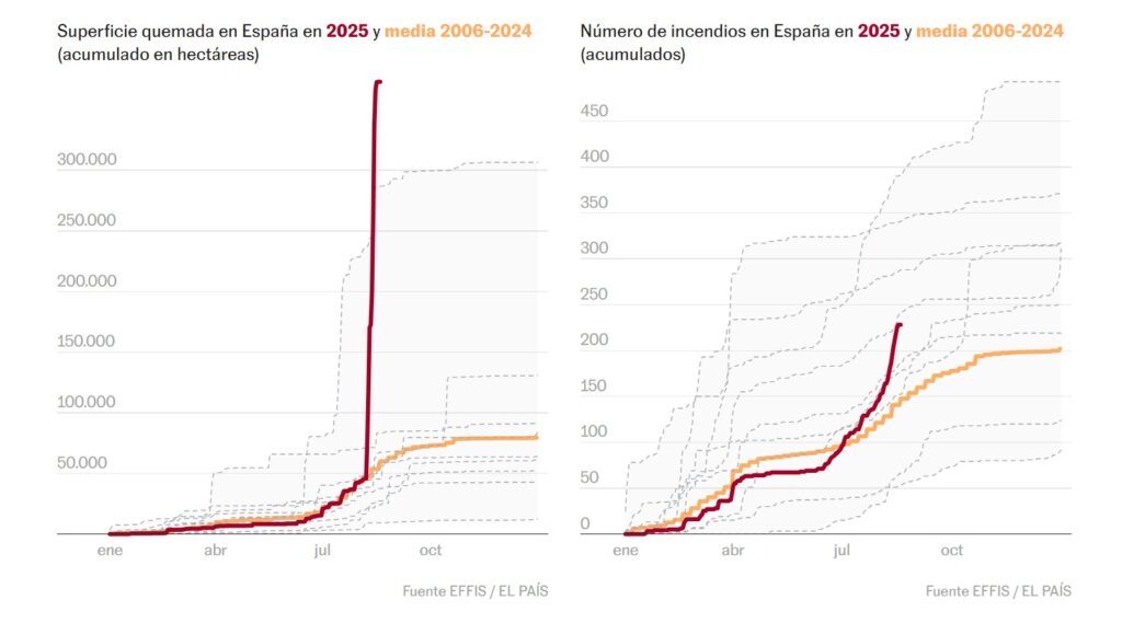 España sufre el peor verano en lo que a incendios forestales se refiere de todo el siglo XXI. De largo, el de más número de incendios y más voraces. A mediados de Agosto ya son 350.000 hectáreas las que se han quemado en todo el país, teniendo en Galicia, Castilla y León y Extremadura su focos más ardientes.