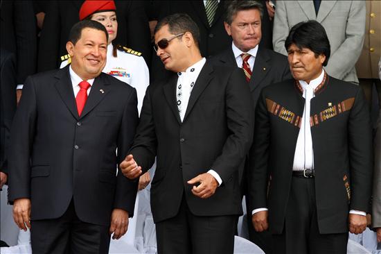 El ueblo eligió «la revolución profunda, rápida y en paz», apostilló el mandatario, que prometió «radicalizar y profundizar» su denominada «revolución ciudadana», pues aseguró que «la revolución es ahora, no mañana». «Radicalizamos la revolución ciudadana, continuando con la política de apertura a todos los países del mundo, en un marco de mutuo respeto, buscando la integración latinoamericana, para seguir construyendo esta Patria Grande, de la que nos hablo José Martí», señaló Correa.De esta forma, y desde el Templo de la Patria, museo histórico construido en las faldas del volcán desde donde se levanta la ciudad de Quito, Correa aseguró que un día como ayer los ecuatorianos no sólo festejaban la independencia histórica de su país lograda en 1822 sino también una «segunda independencia» inaugurada tras su victoria en las urnas el pasado 26 de abril cuando se aprobó su proyecto de reforma Constitucional y fue electo para un segundo mandato. «El 26 de abril el pueblo eligió una revolución profunda, rápida y en paz», señaló Correa. Sin embargo, y a pesar de destacar la consolidación de los distintos procesos electorales en toda la región, Correa señaló que aún queda mucho por hacer en materia de fortalecimiento democrático. «Yo no me hago ilusiones. Tenemos mucho trabajo por delante. Verdaderamente no sé si tenemos muchas democracias en este continente, a lo sumo tenemos elecciones», precisó.Los tres mandatarios se reencontraron en suelo ecuatoriano dos años y medio después de su primera cita en una ceremonia indígena celebrada en Zumbahua, al sur de Quito, donde proclamaron su alianza regional. Bautizados en ese entonces como la «Trinidad Socialista» por la prensa local, Correa apenas se preparaba para asumir el poder. Ayer, con dos años de mandato, recién reelecto y con índices de popularidad superiores a la mitad del electorado, el presidente de Ecuador ratificó su compromiso con el modelo de integración sudamericana de inspiración bolivariana. «La unidad de nuestros pueblos no es simple quimera de los hombres, sino inexorable decreto del destino», enfatizó el ecuatoriano citando a Bolívar, tras lo cual detalló el curso a seguir. «Vamos a ahondar este proceso de revolución ciudadana continuando con nuestra política de apertura a todos los países del mundo, en un marco de mutuo respeto, buscando la integración latinoamericana para seguir construyendo esa patria grande que soñaron Martí y Bolívar», precisó el jefe de Estado local.Asimismo, Chávez, Morales y Correa coincidieron en criticar lo que denominaron como abusos por parte de los medios de comunicación en perjuicio de los gobiernos y de las poblaciones de los países de la región.Por eso, Rafael Correa adelantó que cuando le toque la presidencia rotativa de la Unión de Naciones Sudamericanas (Unasur), promoverá la creación de organismos que puedan actuar contra eventuales abusos por parte de las corporaciones mediáticas. «Cuando sea presidente de la Unasur lo voy a plantear formalmente: crear instancias que defiendan a los ciudadanos y a los gobiernos legítimamente electos de los abusos de la prensa», señaló el ecuatoriano en una conferencia de prensa conjunta.Antes de que el mandatario boliviano se sumara ayer de forma inesperada a las celebraciones por la independencia de Quito, Correa y Chávez se habían reunido en el marco de sus encuentros bilaterales programados para pasar revista a los múltiples convenios que incluyen el intercambio de crudo ecuatoriano por derivados procesados venezolanos, los emprendimientos conjuntos para la exploración de reservas de gas en la bahía de Guayaquil y la construcción de una megarrefinería.Ayer, el análisis de los emprendimientos regionales continuó y en ese marco ambos líderes solicitaron a sus socios sudamericanos afianzar las funciones del Banco del Sur y del Sistema Unico de Compensación Regional (Sucre), señalados por Chávez como dos de los instrumentos que más contribuyen a la creación de un espacio económico común entre los países de la región.El sector energético es el tema de mayor relevancia en esta visita oficial a suelo ecuatoriano, sin embargo, se abordarán a su vez contenidos en los campos productivos, alimentarios, financieros y comerciales.Correa aseguró estar interesado en ingresar al ALBA (Alternativa Bolivariana para las Américas), durante la rueda de prensa conjunta que mantuvo con su homólogo venezolano Hugo Chávez, efectuada este sábado en Quito en una visita oficial de dos días para cumplir con distintos actos oficiales.»Nos atrae mucho la oportunidad de integrarnos a un grupo de países amigos como lo es el ALBA, sobre todo que tienen voluntad integracionista, porque yo creo que en otras instancias de integración caemos en un grave error por supuestamente ser democráticos, ser amplios: por lograr consensos vamos al ritmo del más lento, de los que no quieren la integración y nos frenan ese ímpetu a los que sí deseamos la integración. Creo que eso no se da en el ALBA», comentó Correa.Antes de cerrar el encuentro, el dirigente bolivariano insistió con acelerar la transformación hacia el socialismo en la actual coyuntura de crisis económica mundial, auguró una recuperación lenta pero sostenida de los precios del petróleo y al igual que Correa se mostró favorable a que el Estado asuma el control de aquellas industrias y recursos que se consideren estratégicos. «No nos demoremos, apuremos el paso, aceleremos la marcha compañeros, que la crisis mundial nos obliga. Se nos abre un camino en la construcción de un mundo nuevo, de una forma histórica nueva, que para nosotros no es otra que el socialismo», urgió Chávez. «La revolución es ahora, no mañana», acotó Correa.La alternativa para Correa es profundizar en la integración. Unificar los recursos que Latinoamérica tiene invertidos en divisas en el primer mundo sobre todo en EE UU