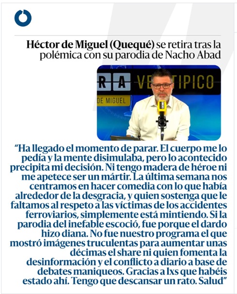 Tras la polémica cobertura -amarillista y sensacionalista- del accidente ferroviario de Adamuz por el presentador de Código 10 (Cuatro) Nacho Abad -criticado por enseñar imágenes explícitas de personas atrapadas en el accidente de tren de Rodalíes en Barcelona, o por cortar de manera grosera a un representante de los trabajadores ferroviarios porque éste, que pedía cautela y respeto para las víctimas, no entraba al juego de las conclusiones precocinadas de Abad- el humorista realizó en su videopodcast Hora Veintipico de la Cadena Ser una divertida parodia del presentador de Cuatro.