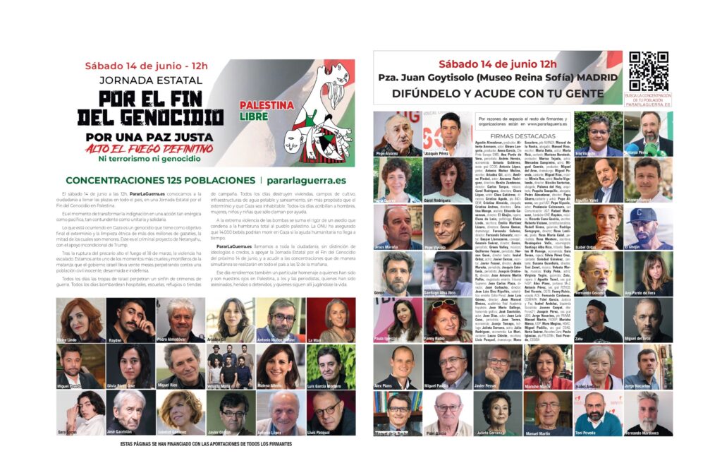 «Por una Paz Justa. Palestina Libre. Alto el Fuego Definitivo. Ni terrorismo, ni genocidio» es el lema de la convocatoria bajo el que se unirán 125 concentraciones en toda España, que en Madrid se celebrará en la Plaza Juan Goytisolo. Protestas que cientos de intelectuales, artistas y profesionales promueven al suscribir el séptimo manifiesto del movimiento PararLaGuerra.es